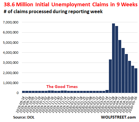 In the week ended May 16, state unemployment offices processed 2.438 million “initial claims” for unemployment insurance under state programs, bringing the total number of initial claims over the past nine reporting weeks since mid-March to a mind-bending 38.6 million (seasonally adjusted). The claims reported by the US Department of Labor this morning were over three times the magnitude of the prior weekly records during the unemployment crises in 1982 and 2009.
