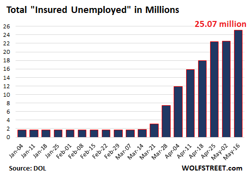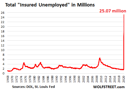 Laid-off workers who filed an “initial claim” for Unemployment Insurance (UI) and state programs and who are still looking for a job a week later are added to the “insured unemployment.” The number of these “continued claims” spiked by 2.525 million to 25.07 million, having weeks ago blown past the pre-Covid-19 record of 6.63 million in May of 2009: