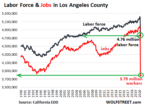 In Los Angeles County – with a population of 10 million – jobs fell off a cliff. This is where California’s largest and most intense outbreak of Covid-19 was threatening to spiral out of control, New-York-City-like. A lockdown and social distancing brought it under control and prevented a New-York-City-like tragedy. But the job market imploded.