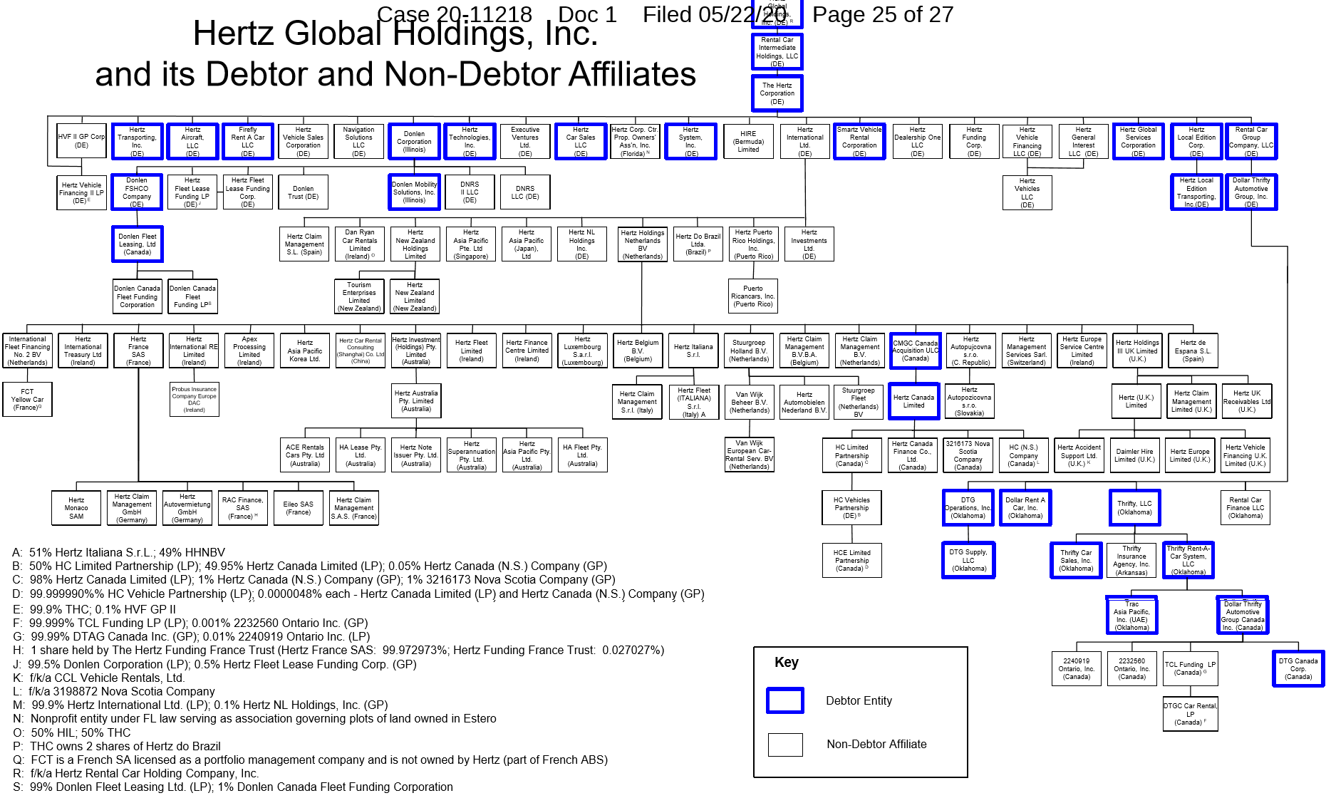 Below is a chart of Hertz’s corporate structure, as shown in the bankruptcy petition; the blue boxes denote the entities that are included in the bankruptcy; the other boxes are the entities that are not included (click to enlarge):
