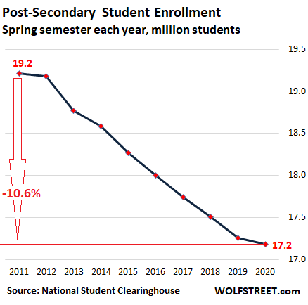 The pandemic threw higher education into chaos in the middle of the spring semester. How this will pan out for students, colleges, the whole army of people that works in higher education, the asset class of student housing, student housing mortgages packaged into commercial mortgage backed securities (CMBS), text-book publishers, and the rest of the industries surrounding the sector is highly uncertain. But even before the crisis hit, before the shutdowns, student enrollment in the spring 2020 fell for the ninth year in a row.