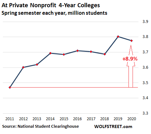 Back in the spring of 2019, enrollment at private nonprofit four-year colleges – this includes some of the most elite universities in the US – had jumped 3%, the largest percentage increase since 2012, after years of stagnating or declining. But this spring, enrollment declined 0.7% to 3.78 million students. Nevertheless, since 2011, these institutions have gained 8.9% in enrollment: