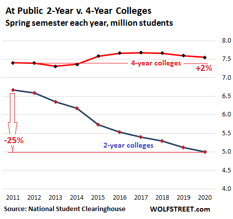 At public two-year schools, the 2.3% drop in enrollment this year added to the drop in prior years; and since the spring semester of 2011, enrollment has plunged by 25%, or by 1.67 million students, pushing the total down to 4.997 million students (blue line in the chart below).