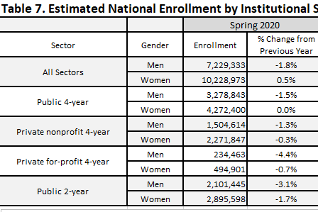 Men accounted for just 41.4%, or 7.2 million students, of total student headcount in the spring semester. The enrollment of men has continued to decline every year since 2011, including by 1.8% this spring semester, by 2.8% a year ago, and by 1.9% two years ago.