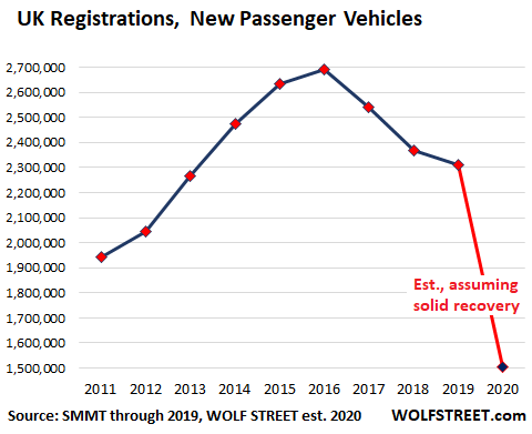 But UK auto sales already declined in the three years before Covid-19. By 2019 sales were down 14% from 2016. For the first four months of 2020, sales are down 43% according to SMMT. Given another 97% collapse in May, as dealerships remained closed, and assuming a solid recovery going forward, WOLF STREET estimates that sales for the whole year will be down around 35% (red line):