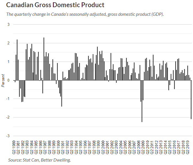 Canada’s economy has been slowing in growth for a few quarters, even before the pandemic. It got much worse after the economic lockdown. Stat Can reported GDP fell 2.11% in Q1 2020, when compared to the previous quarter. Pre-pandemic growth in Q4 2019 also wasn’t very impressive though, coming in at the weakest level since the 2015 oil crash. With the exception of some noise in Q2 2019, GDP growth has been trending lower since the back half of 2017. This view gets even worse if you’re looking at the issue on a per capita basis.
