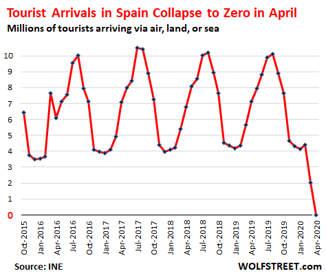 In April, for the first time since records began, no — meaning officially “zero” — foreign tourists arrived in Spain, and foreign tourists spent “zero” in Spain, the world’s second most visited country in 2019, as its borders were essentially closed to foreign visitors for the duration of the month, according to new figures published by the country’s Institute of National Statistics (INE). Here are the first three (slightly truncated) paragraphs of the accompanying press release (translated by yours truly):