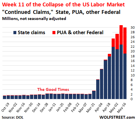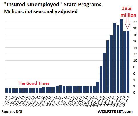 The total number of people who are still receiving unemployment benefits and who have not yet found jobs or gotten their old jobs back – the “insured unemployed” – under all state and federal programs fell by nearly 1 million to a still gut-wrenching 29.97 million (not seasonally adjusted):
