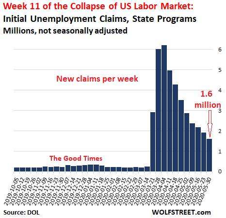 About 1.6 million workers filed initial unemployment claims under state programs (not seasonally adjusted) in the week ended May 30, a clear sign that layoffs continue at a gut-wrenching and previously unimaginable pace, nearly three times the magnitude of the weekly records during the unemployment crises in 1982 and 2009. But it was way down from the 6-million range of initial claims during the weeks in early April: