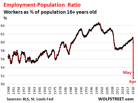 The Employment-Population Ratio rose to 52.8% in May, the second-lowest rate in the history of the data going back to 1948, after the collapse in April (to 51.3%). This ratio is the percentage of people who have jobs compared to the overall working-age population (16 years and older). It includes full-time, part-time, and gig workers: