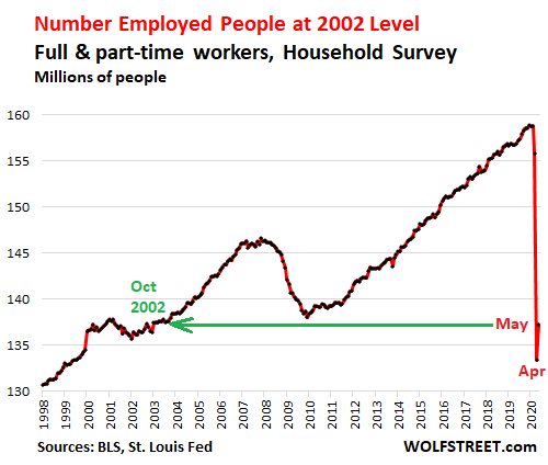 The number of people with jobs, according to the household surveys, rose by 3.8 million people in May, from April, which includes gig workers and part-time workers. This rise came after the 22.4-million plunge in April and the 3.0-million plunge in March. All combined, over the past three months, the number of employed people has plunged by 21.5 million.