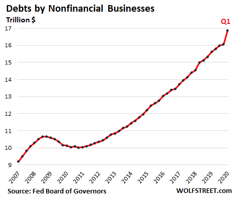 Business debts already skyrocketed in the first quarter, according to data released yesterday by the Fed’s Board of Governors. In Q1, total “nonfinancial” business debts, which include corporations and other businesses but not financial intermediaries such as banks (that borrow to lend, and including them would result in double-counting a lot of debts), jumped to $16.86 trillion.