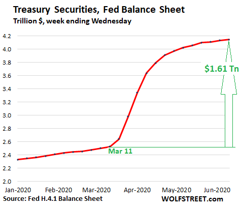 From early March through its balance sheet released yesterday, the Fed added $1.61 trillion in Treasury securities to its assets as part of its Everything Bubble bailout program. Over the same period, the US debt soared by an additional $2.5 trillion. The Fed has thereby indirectly – as is the rule in the US – monetized 65% of this additional debt.