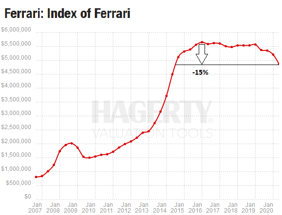 Price changes ranged widely among Hagerty’s seven primary indices, with the Ferrari Index and the Blue Chip Index experiencing the biggest price declines, and with the Affordable Classics Index experiencing the only price gain.