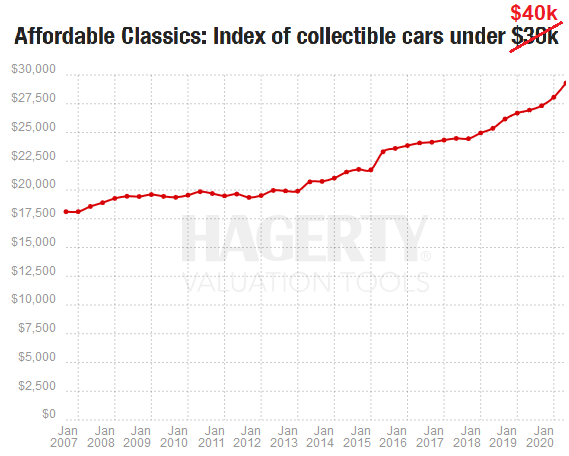 The index has been on a consistent up-trend since 2015, with the average price gaining about 30% over the period. These price increases have caused Hagerty to raise the cutoff price for “affordable” from $30,000 to $40,000 recently, but the chart still says $30,000 (I added the red adjustment to reflect Hagerty’s text):