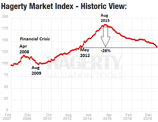 The Hagerty Market Index – which tracks prices and volume of classic cars that sold at auctions and private sales, and is adjusted for inflation – dropped 1.9% in June from May to a value of 138.07. It is now down 11.8% from a year ago, and 26% from the all-time high in August 2015. During the Financial Crisis, the index fell 16% peak-to-bottom (chart via Hagerty, notes added):