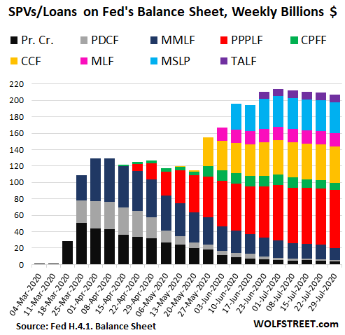 The balance of these entities combined dropped by $3 billion from the prior week to $208 billion, the lowest since June 17. But note how the composition has changed: The original three entities are being phased out, as new ones have been added. The PPP loan facility is by far the biggest ($71 billion):