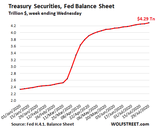 After having ticked up last week at the smallest rate all year (+$6 billion), the balance of Treasury securities this week rose by $34 billion, to $4.29 Trillion. The varying levels of increases in recent weeks and before March are related to the twice-a-month dates when maturing Treasury securities are redeemed, and when the Fed books those redemptions (Fed gets its money back from the government).
