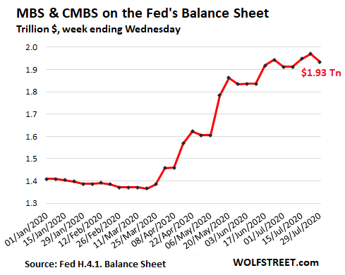 Commercial mortgage-backed securities (CMBS) are included in the balance of MBS – one of the bailout programs the Fed kicked off in March. These are “Agency CMBS” – secured by apartment-building mortgages that are fully guaranteed by Fannie Mae, Freddie Mac, and Ginnie Mae – are a relatively small portion of the CMBS universe.