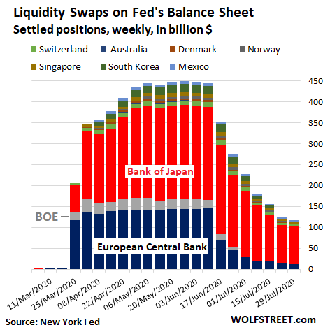 The Fed’s “dollar liquidity swap lines” – which provided other central banks with dollars during the crisis – are falling out of use, though the program itself has been extended, just in case. This was the seventh week in a row of declines, now down to $117 billion: