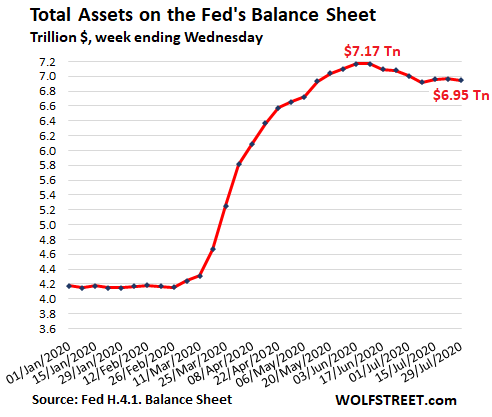 Week seven since peak balance sheet: Total assets on the Fed’s balance sheet for the week ended July 29, released this afternoon, fell by $16 billion from the prior week, to $6.95 trillion. Since June 10, when they’d hit $7.17 trillion, they have declined by $220 billion: