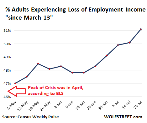 The latest survey was for “Week 12” – data collected from July 16 through July 21. It showed that of the adults (aged 18+) in the US, an astounding 51.2% had experienced a “loss of employment income” for whatever reason during the Pandemic. This was up from 47.0% during “Week 1” ended May 5: