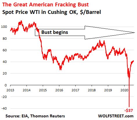 But one thing has become abundantly clear over the past few years: If there is enough money, the shale oil-and-gas business can ramp up production at lightening speed, which is what happened in late 2016 after phase 1 of the Great American Oil Bust, when Wall Street unleashed the opportunity seekers as crude oil prices were rising again. This newly resurging production then led to the next glut and phase 2 of the Great American Oil Bust, with prices heading lower again starting in the fall of 2018. And as this was playing out, it ran into the collapse of demand during the Pandemic.
