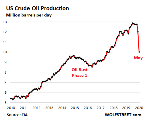 US crude oil production in May plunged by 1.99 million barrels per day, from 12 million b/d in April to 10 million b/d, the largest monthly drop since at least 1980, and the sixth monthly drop in a row, according to the EIA.
