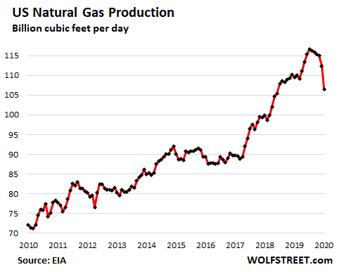 Production of natural gas peaked in November 2019 at 116.6 billion cubic feet per day and has since then dropped 8.7%, including 5.3% from April to May. In terms of cubic feet, the 5.9 million cf/d drop in May was the second largest drop ever: