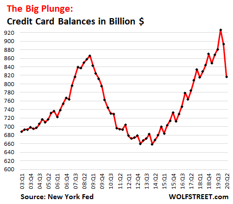 Revolving consumer credit consists of credit card debt and other revolving credit such as personal loans. Credit card debt by itself – a data set that the New York Fed provided in its Household Credit Report – fell by $82 billion in Q2, to $820 billion.