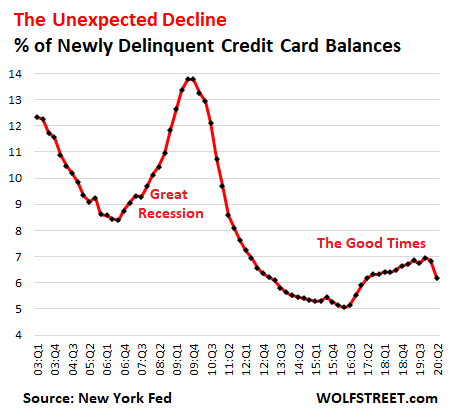 During the Great Recession, as people who’d lost their jobs were falling behind on their credit cards, newly delinquent balances soared to approach 14%. This wasn’t just subprime, but all balances combined! Then, during and after the Great Recession, as lenders and consumers went through a painful cleansing process, newly delinquent balances declined and finally hit a two-decade low in early 2016. Then they rose again during the Good Times as the subprime segment got into trouble funding these Good Times. But in Q2 came the Pandemic economy, and suddenly newly delinquent balances dropped to 6.2%: