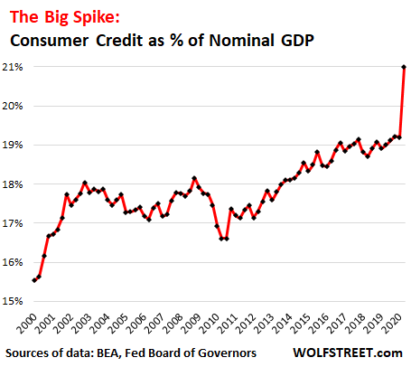 Consumer debt – student loans, auto loans, credit cards, other revolving debt and personal loans but excluding mortgages and HELOCs – declined to $4.1 trillion (not seasonally adjusted) in the second quarter, according to Federal Reserve data. It declined because credit card debt plunged – we’ll get to that phenomenon in a moment. But as the economy took a broadside in the second quarter, with 32 million people claiming unemployment insurance, consumer debt as a percent of “nominal GDP” spiked from the already record high 19.2% at the end of the Good Times in Q4 2019 and Q1 2020 to 21% at the end of the second quarter: