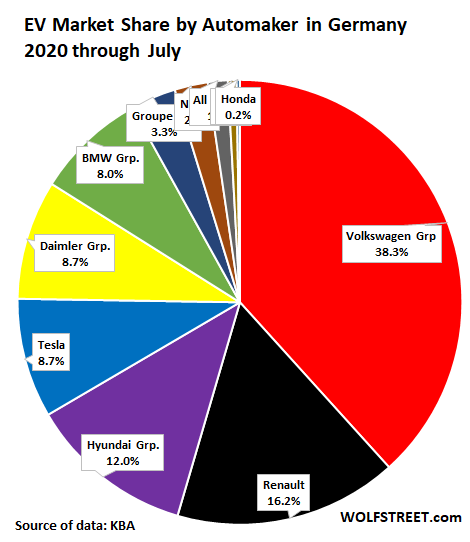 It has been a very ugly year in Germany for auto sales, except for EVs. The overall new vehicle market in Germany has plunged by 30% in the first seven months of 2020 to 1.526 million units. But EV sales have skyrocket by 65% over the first seven months, after having already skyrocketed by 88% in the same period in 2019, according to KBA, the German agency that handles nationwide new-vehicle registrations. Year-to-date, 61,105 EVs were sold, giving EVs a share of 4% of total new vehicle sales, up from less than 1% just two years ago in 2018.