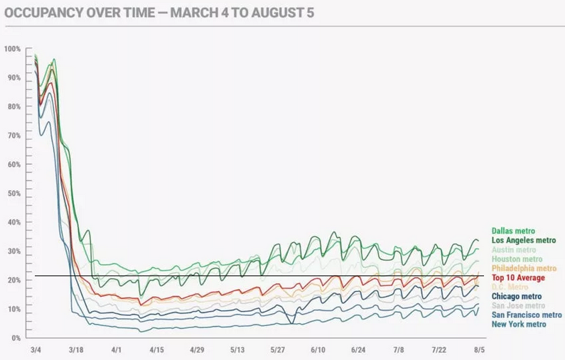 Office occupancy collapsed in March and April as people stopped going to the office, and the 10-metro average hit a low of around 15% – meaning that office occupancy, as measured by employees entering the office, was down 85% from pre-Pandemic levels. Then there was a mild recovery. But the recovery stalled in mid-June. The average of the top 10 metros (red line in the chart) is at 22.6%, just below where it had been in the week of June 17. I added the black horizontal line, from the current value of the top-10-city average (click on the chart to enlarge it):