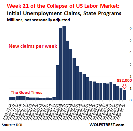 Initial claims under state programs, filed by newly laid off people who’d been regular employees, though still catastrophically high during the week, were on a “not seasonally adjusted” basis below the 1-million mark for the second week in a row, at 831,856, down from 988,309 last week, “not seasonally adjusted.”
