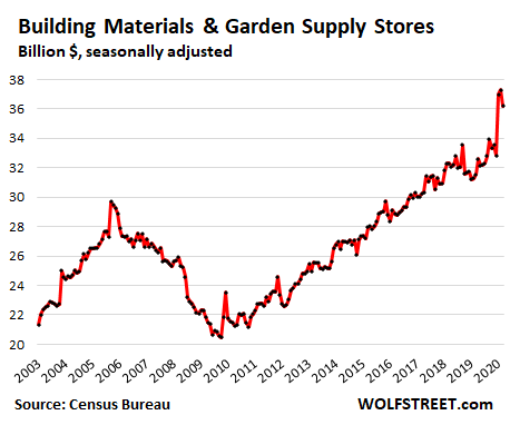 Sales at building materials, garden supply and equipment stores (including neighborhood hardware stores and big-box stores like Home Depot) had spiked 13% in May from April, ticked up further in June, but fell off some in July.