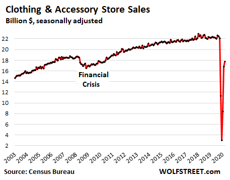Sales at clothing and accessory stores had already stagnated for years. When the Pandemic hit, sales collapsed by 86% to just $3 billion in April, then bounced off. But in July, at $17.7 billion, sales remain 21% below a year ago, and right back where they’d first been in July 2006. People buy lots of clothes and accessories, but they discovered how to buy them online: