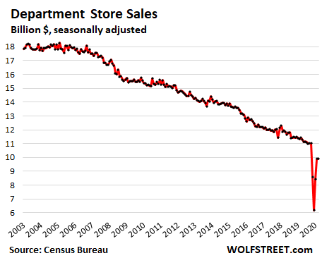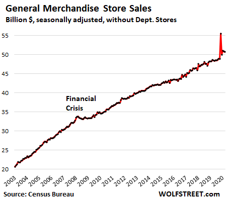 Sales at general merchandise stores without department stores had spiked by 14% in March but since then given up nearly all of that spike. In July, sales ticked down further, but at $50.7 billion were still up 4.4% from a year ago. Walmart and Costco are in this category:
