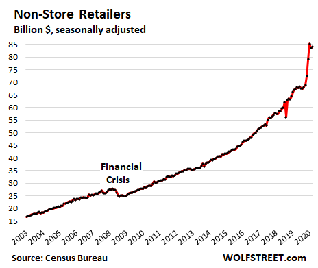 This category overlaps with much of ecommerce but also includes other non-store retailers such as mail-order operations, door-to-door sales, and sales at stalls and vending machines, which have gotten crushed. Proper ecommerce sales for Q2 will be released in a few days.