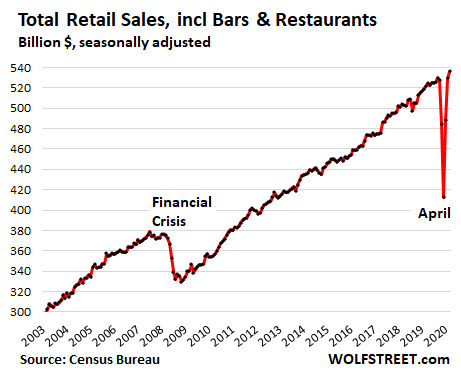 Retail sales show how this panned out – and there are large differences by category, reflecting big shifts in how and on what Americans spent their money. According to Census Bureau data this morning, total retail sales in July ticked up by 1.2% from June, to $536 billion (seasonally adjusted) after some big bounces in May and June, from the collapse in March and April. Compared to July last year, total retail sales were up 2.7%: