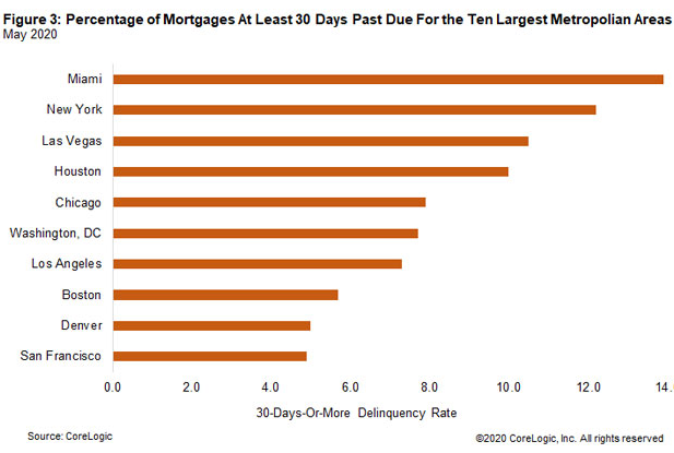 Last week, CoreLogic released a report that showed the 30-plus day delinquency rates in the 10 largest metropolitan statistical areas through May. So this lags by one month the MBA’s report, but provides insights by metros. These delinquency rates at the end of May ranged from 4.9% for the San Francisco metro, to 13.9% for the Miami metro. This data also includes mortgages that were delinquent before they entered forbearance (chart via CoreLogic):