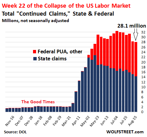 Data chaos of the labor market continues with the two government data providers wildly contradicting each other: The weekly unemployment insurance report today by the Labor Department, which shows a still catastrophic situation of over 28 million people claiming unemployment insurance under all programs; and the monthly jobs report by the Bureau of Labor Statistics which asserted that in July, there were only 16.8 million unemployed.