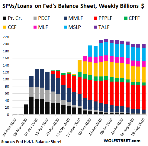 The Fed holds the corporate bonds and bond-ETFs it purchased in the SPV Corporate Credit Facilities or CCF (yellow in the chart below). The balance of the CCF has been about $44 billion since mid-July. But the Fed didn’t buy $44 billion in corporate bonds and ETFs. Far from it.