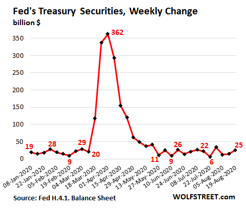 All year, the Fed has increased its Treasury holdings in a range between about $6 billion and $29 billion a week, except for the 10-week period, starting in mid-March and ending in mid-May, when it went hog-wild, buying as much as $362 billion in the week ended April 1. So this – the weekly increases in its holdings of Treasury securities since January 1 – makes for a crazy chart, to document our crazy times: