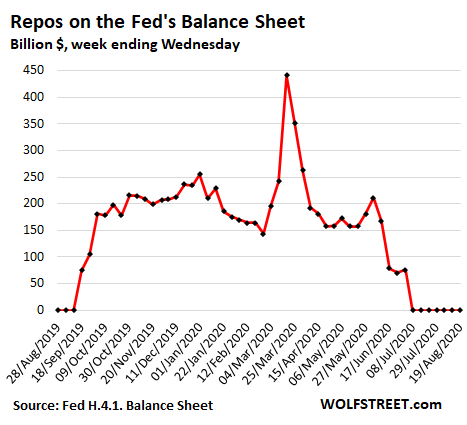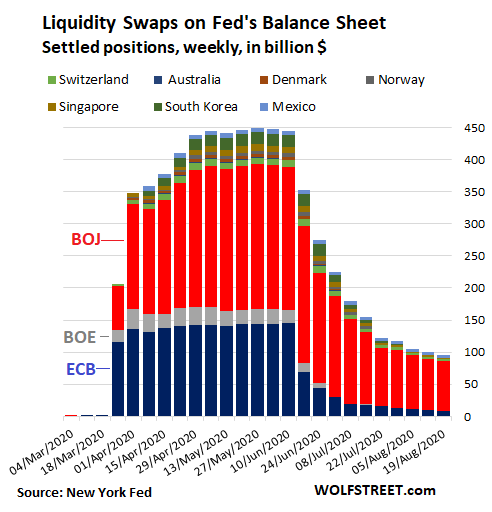 The Fed’s “dollar liquidity swap lines” by which it provided dollars to a select group of other central banks, are falling out of use and are down to $96 billion, from a peak of $448 billion in early May. The Bank of Japan accounts for $77 billion, or 81% of the total. Swaps with the ECB fell to $8.7 billion. Swaps with the Bank of Mexico have been flat at $4.9 billion since the beginning of July. Swaps with the Swiss National Bank ticked down to $2.8 billion. Swaps with Singapore were flat $1.9 billion. Swaps with the rest of the central banks have matured: