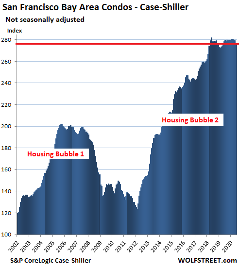 Condo prices fell 1.1% in June from May, third month in a row of declines, now totaling 1.6%, during what is normally peak season. The index is now down 0.7% from June 2019 and is down 0.2% from June 2018: