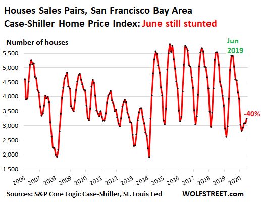 Sales pairs of single-family houses plunged 40.2% year-over-year in June to just 3,242 houses. The percent-changes in “sales pairs” are an indication of changes in sales volume. In the index, June and July reflect the spring selling season and are normally the peak months of the year, as you can see in the chart below, but not this year: