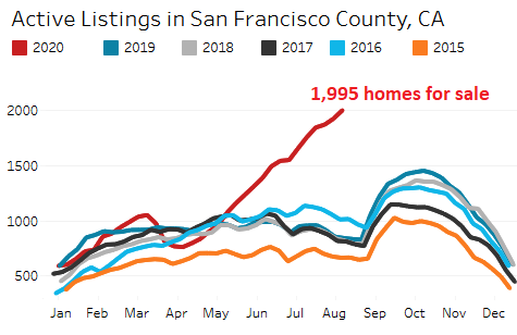 “Active listings” in San Francisco skyrocketed by 137% year-over-year to 1,995 homes for sale in the week ended August 16, based on weekly data compiled by real-estate brokerage Redfin, from Multiple Listing Service (MLS) and Redfin’s own data. This is the biggest highest most stunning amount of inventory for sale since the very peak of Housing Bust 1 (chart via Redfin):