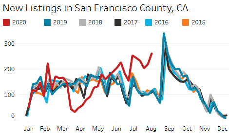 New listings jumped 124% from a year ago to 260 in the week ended August 16, according to Redfin data (chart via Redfin):