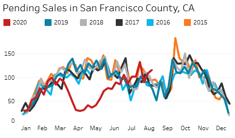 Weeks’ supply of homes for sale has more than doubled, from 9.3 weeks last year at this time to 21.2 weeks as of August 16, at the current rate of sales. The spike of supply through early May was a result of sales having collapsed in March and April (chart via Redfin):